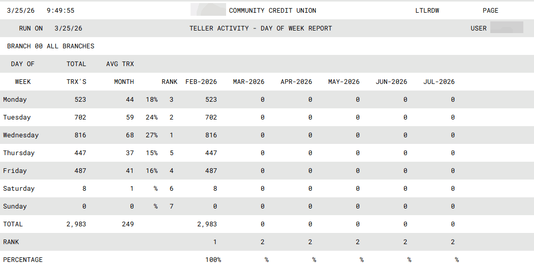 LTLRDW-01 Teller Activity Reporting 915 LTLRDT, LTDRDW þ As of Month End ¨ Right Now |