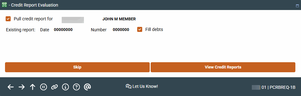 This window is used to verify the status of any online credit reports on file for this member. If the existing report date and number read 000000, there is no report on file for this SSN. If a date exists, your credit union policy will dictate whether or not a new report should be pulled at this time.