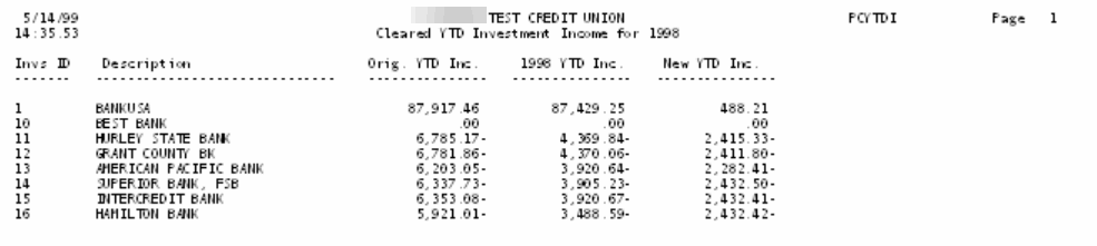 What this means is that if this option is run more than once for the same year, the total will be subtracted from YTD income more than once, resulting in an inaccurate YTD total. This must be fixed manually by making an adjustment to each investment—obviously a time-consuming process. Therefore, be very careful not to process this for the same year more than once!!