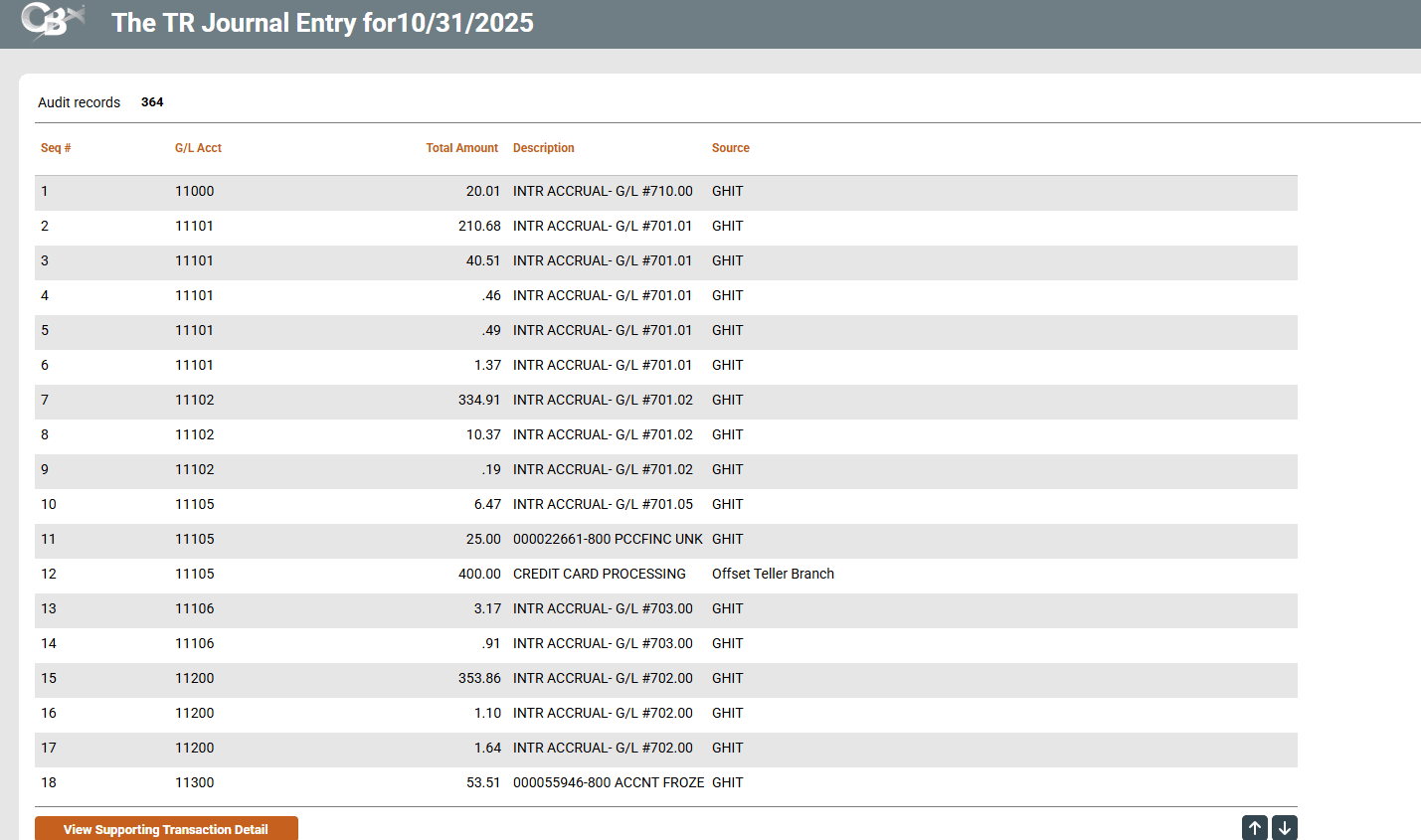 View TR entries that fit the selection criteria entered on the entry screen. Select an entry and then View supporting transaction detail to access the Supporting Member Transaction for Journal Entry screen.