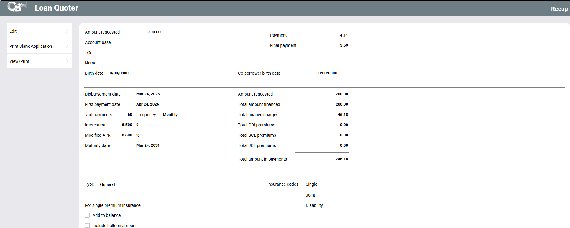 If desired, use Print Blank Application to print a blank copy of either the standard CBX loan application or any of your custom forms.