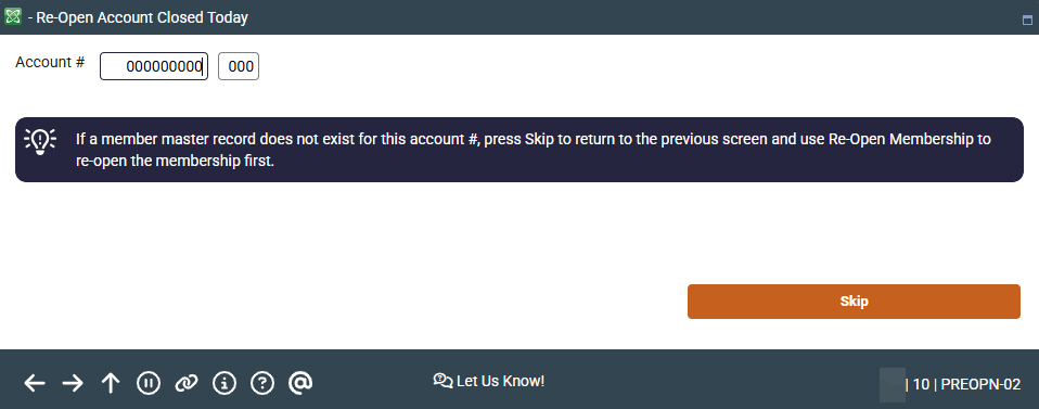If a member master record does not exist for this account number, press Skip to return to the previous screen and use “Re-Open Membership” (M) to re-open the membership first.