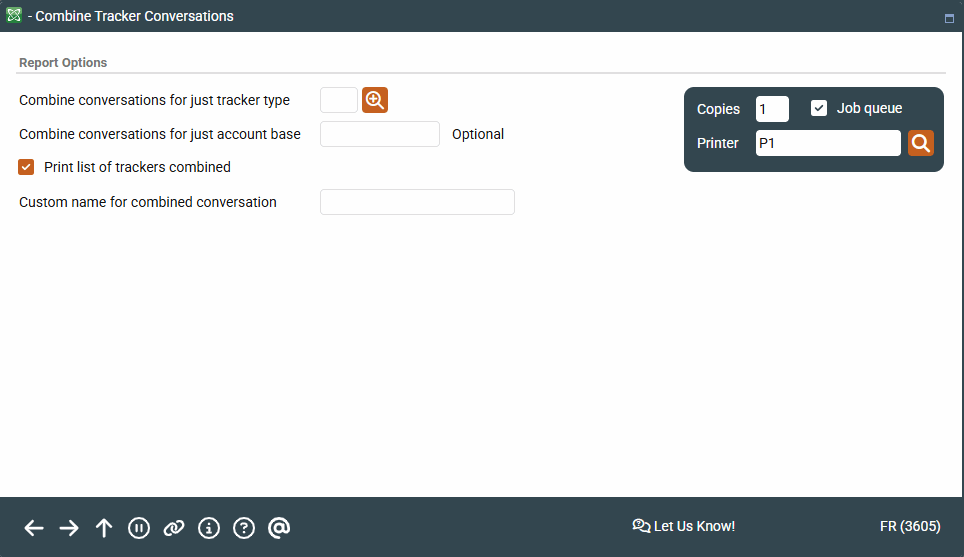 Access this screen by selectingTool #231:Combine Tracker Conversations.
