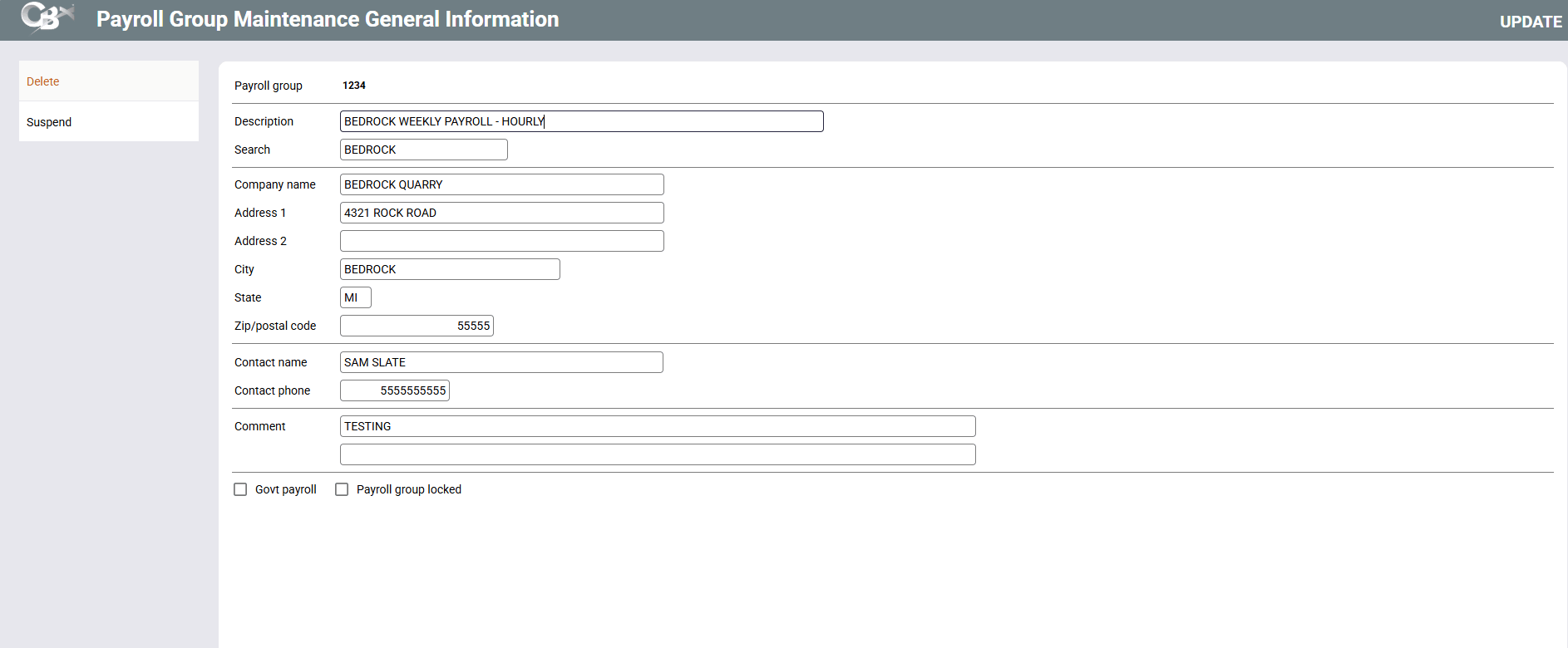 Use this to delete the entire Payroll Group record. There will be one confirmation message.