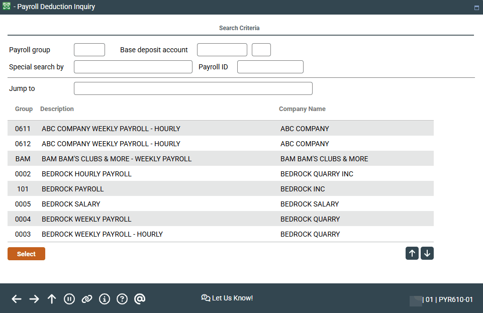 The Search for field can be used to scroll through the list at the bottom of this screen. Enter a Payroll Group description and use Enter to scroll to the first item that matches; items will be in order by Payroll Group.