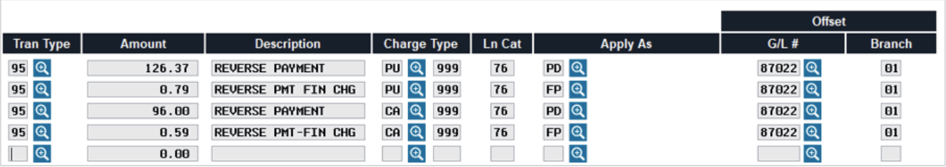 Remember that just like with other types of loans, if reversing a payment on an account that had a subsequent payment applied, you would not reverse the finance charge paid as the subsequent payment would automatically have paid any finance charges first before affecting principal.
