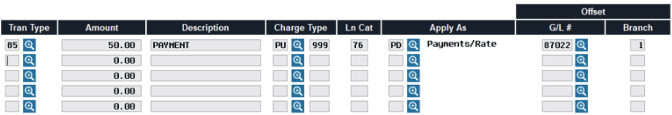 There are two fields here, one for the charge type (PU, CA, or BT) and the other for the charge type code number (999 for the default bucket, or another number to offset a promotional bucket). If more than one bucket should be affected, you will need to create multiple transactions (up to 5 can be posted at one time on this screen). If using Tran Code 85 to post a regular payment, this field is not required assuming you wish the system to apply the payment as it would normally using the configured matrix. If you do wish to specify a charge type on a regular payment, be sure to also complete the Apply as field. For all other transaction types you will need to designate which charge type bucket should be affected, depending on what end result you are trying to achieve on the member’s account. |