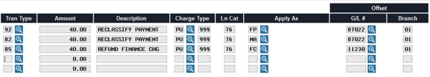 This example shows refunding $40.00 worth of interest (finance charges) that was overcharged from a previous period. Because the money was already paid by the member, you will need to reduce both the finance charges charged and paid and reclassify the payment to the correct bucket.