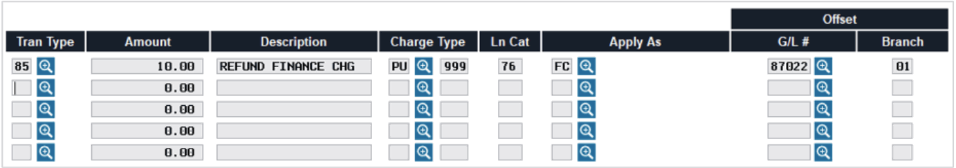In this example, the member was charged a 10.00 finance charge in error, but it has not been added to the YTD paid. This transaction reduces the balance, reduces the amount of finance charges charged, and the income G/L for finance charge income is reduced by the amount previously booked.