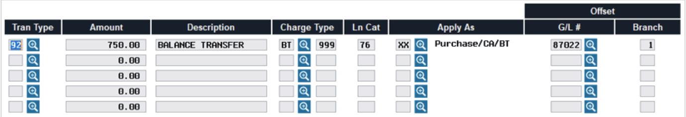 This example shows how to use the Account Adjustment feature to post a balance transfer transaction, such as to pay off a member’s other credit card balance.