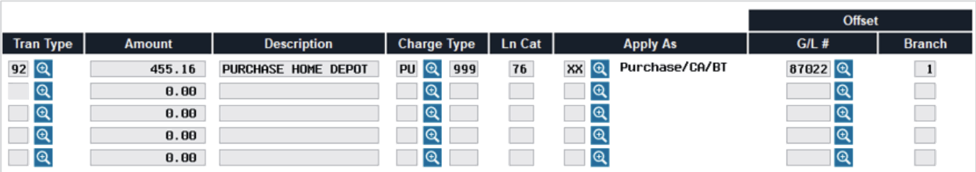 Transactions must be flagged as belonging to one of the charge type buckets (PU, CA, or BT) configured under the loan category. When you post an adjustment, you will need to designate to which charge type code the transaction belongs (such as PU999 or PU001). If more than one bucket is involved, you will need to post multiple adjustment transactions.