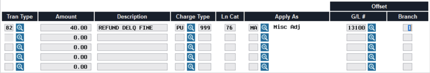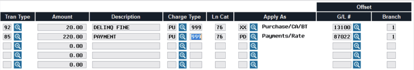 In this example, the Apply as code on the first transaction was set to “XX” because that is how a delinquency fine would ordinarily be handled by automated payment processes. You could choose to use “MA” if you wanted it to appear summarized in the “Misc. Adjustments” line on the statement summary (see Page 3).