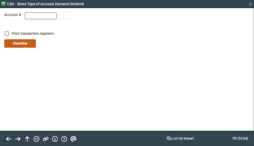 This second screen is used to specify the account number and suffix from which the dividend is to be paid. If Name ID is activated, you will need to enter the Name ID of the member. Learn more about Name ID configuration. Then choose whether or not to print a transaction register report showing the payment transaction. (If this field is left unchecked, the system assumes you do not want a report.)
