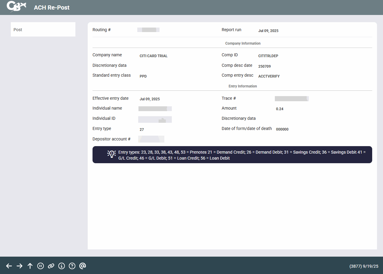 Review items on the screen, then use Post to repost this exception. You will return to the ACH Exceptions screen or move to the next item to be posted.