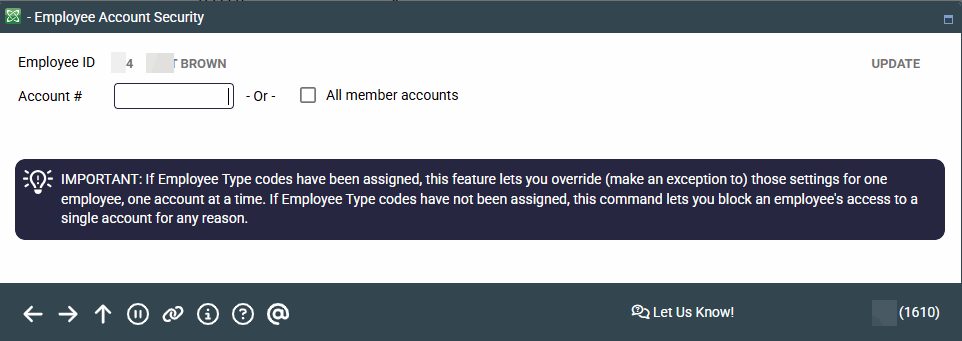 To change this employee's access to a single member account (or to delete an existing override record), enter the member account base and use Enter to proceed to the second screen.