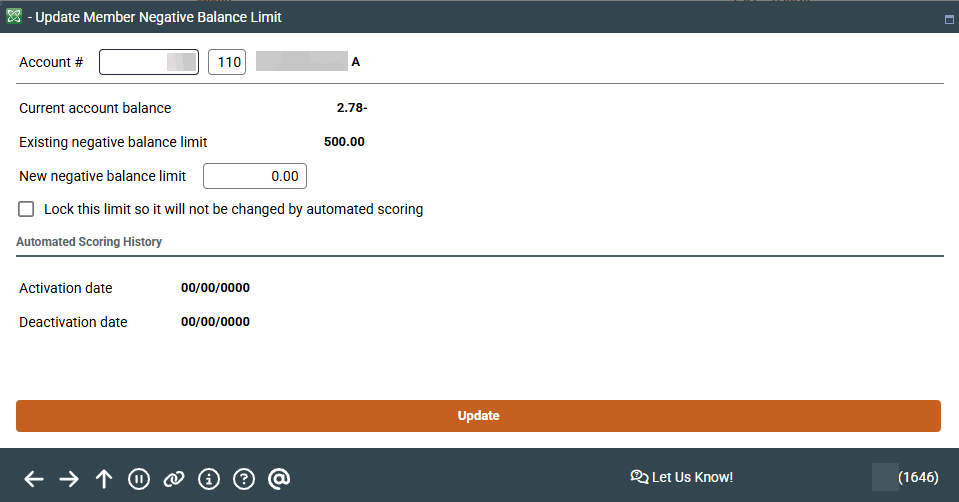 Remember that if you enter 0 (or blank) as the limit, no additional items can be posted negative to the account. If this is a “trouble” member you would like to remove from the courtesy pay program altogether, after setting the limit to 0, you should also lock the account so he or she is no longer considered for a new limit in the future.