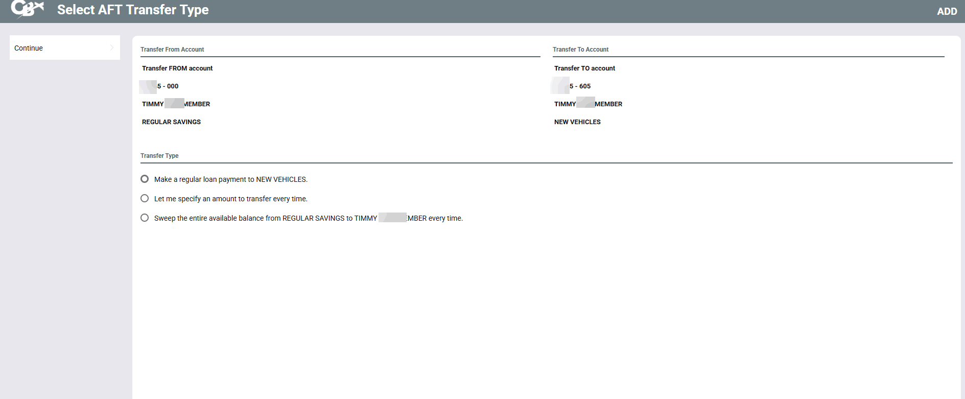 Special rules apply to AFTs to and from accounts that are "off the books" such as deposits on a loan at another credit union. These type of transfers need to be specially activated. For more information refer to the Automated Funds Transfers (AFT) / Check Funds Transfers (CFT) booklet. If you are creating an AFT to an account with an A2A relationship and wish to change the account, a Change A2A account will be available for you to do so.