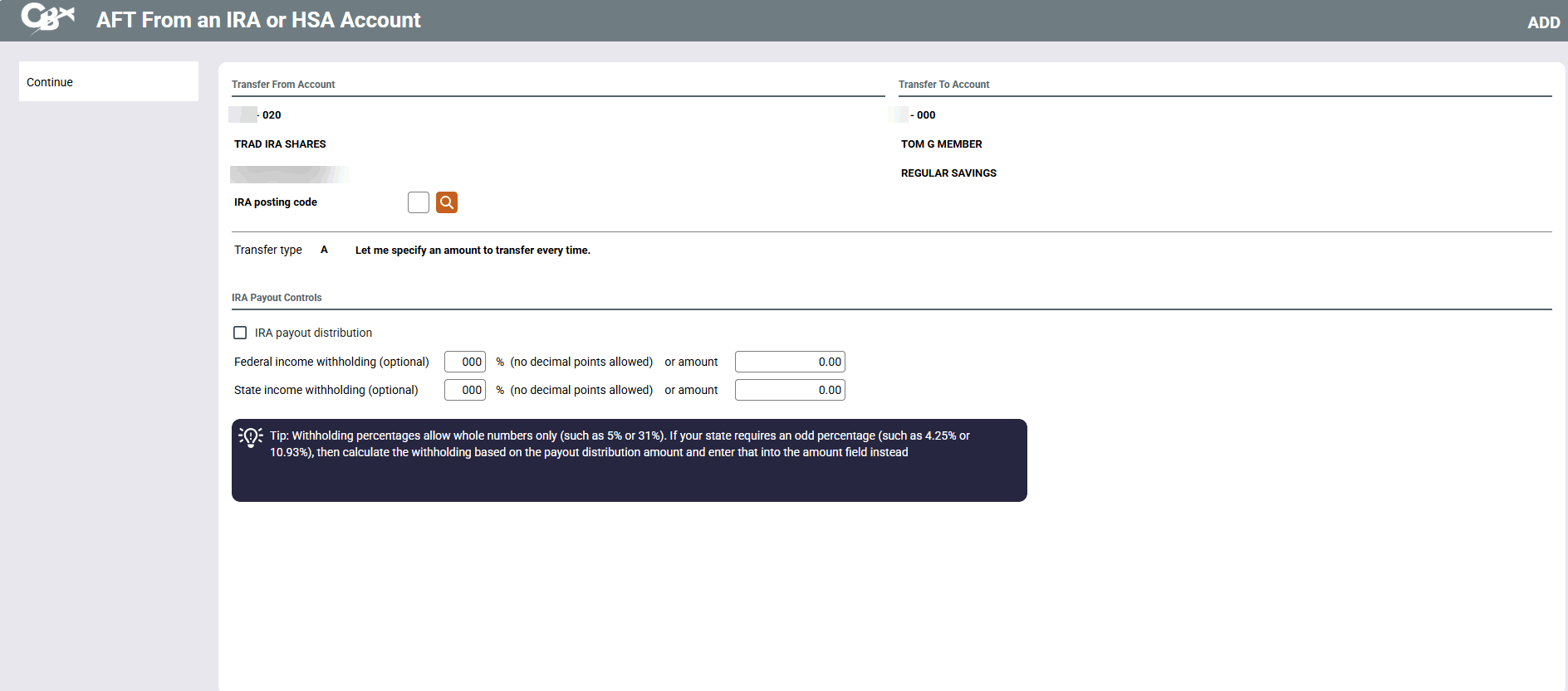 If this transfer is an IRA Payout Distribution, the member may choose to set up federal income tax withholding. The amount can be a fixed amount or a percentage of the Transfer amount.