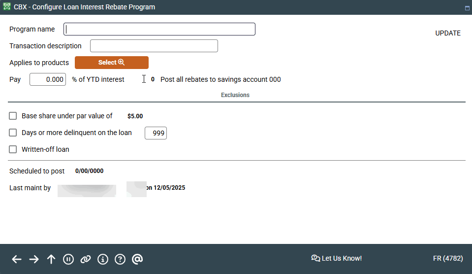 Access by selecting "Loan Interest rebate (LNCATG)" on the Add a Program screen or by selecting a loan interest rebate program and Change or View on the initial Bonus Dividend/Loan Rebate Program screen.
