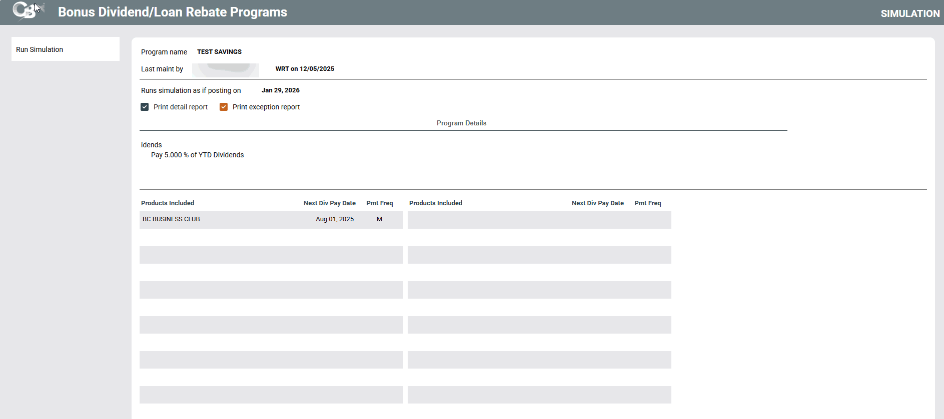 Use Run Simulation to run the simulation. At that time the three simulation reports will print. Different reports are printed for share bonus dividend programs than for loan rebate programs..