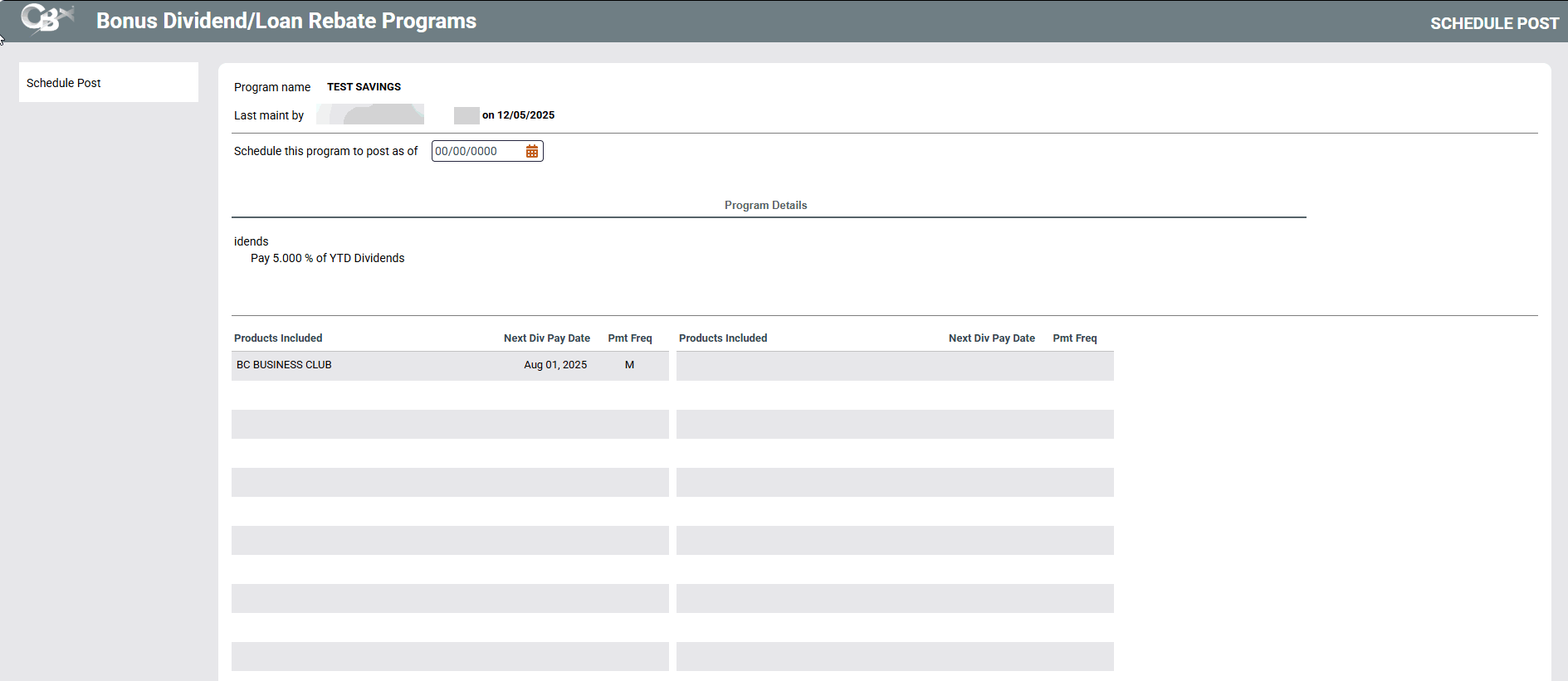 On the date selected, the program will run and the share bonus dividend and loan rebate will be paid to the base share account. The year-to-date loan interest will also be adjusted, and the three posting reports will print. Different reports print for share bonus dividend programs than for loan rebate programs.