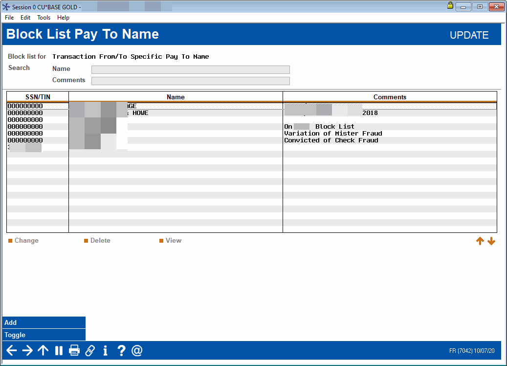 Use Toggle to toggle between the comment and the last maintenance information. Comments may be used to indicate why the entry was added to the fraud block list.