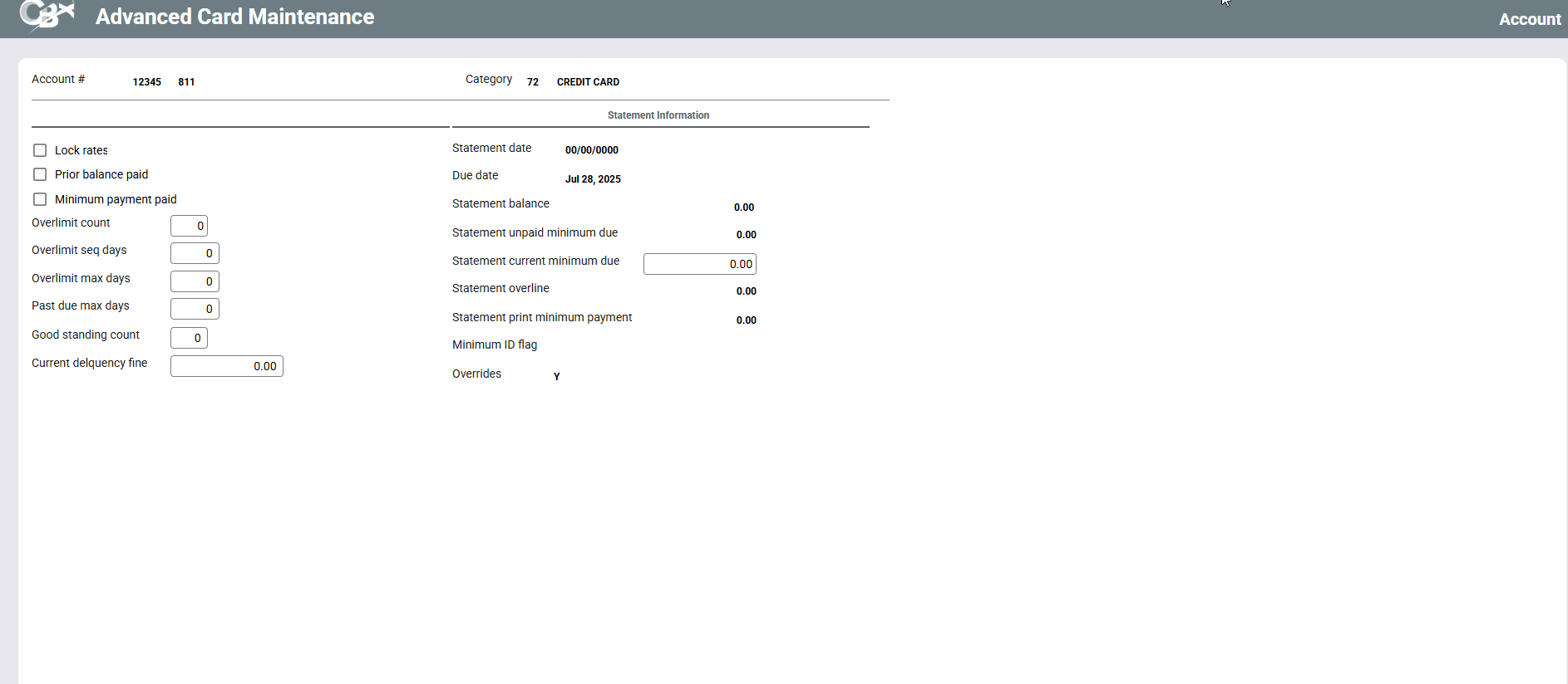 This flag is used to indicate when the current minimum amount due is different from what the normal calculated amount would be, for one of the following reasons: M - Amount was changed Manually by changing the Current minimum due amount on this screen. Affects the current payment cycle only. O - Amount was overridden using the Payment Change feature. Remember that this type of change could affect multiple future payment cycles as well. Z - Zero payment amount (“skip a pay”) was entered using the Payment Change feature. Each zero-payment record affects one cycle only. NOTE: This flag relates to now; the Overrides flag described below relates to a future month. See the Credit Card User Guide for details. |