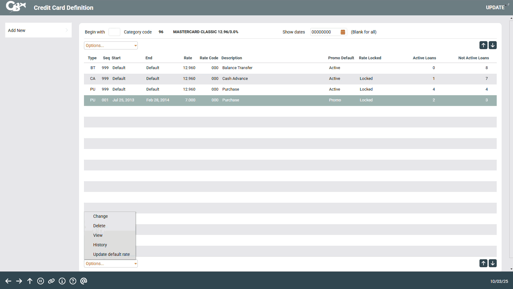 The core must have at least one default code for each charge type you intend to use. At the very least, create charge types for purchases (PU) and one for Cash Advances (CA). If you will allow Balance Transfer transactions, you will also create a BT charge type. The core automatically assigns a 999 sequence number to the first charge type ‘bucket’ created for that type. The 999 default bucket in each category is created with no start or end date so they never expire. If you update the rate on a default bucket, the subsequent bucket will be numbered 998, 997, 996 and so forth. These buckets are the default for each charge type. You create a new default when you wish to change the rate on the charges to the bucket. See “To update a rate on a default bucket” below.