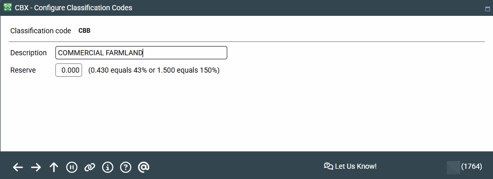 On this second screen, enter a complete description of the Classification Code. Use the final field to enter a percentage to be used in calculating loan loss reserve amounts for loans flagged with this classification code.