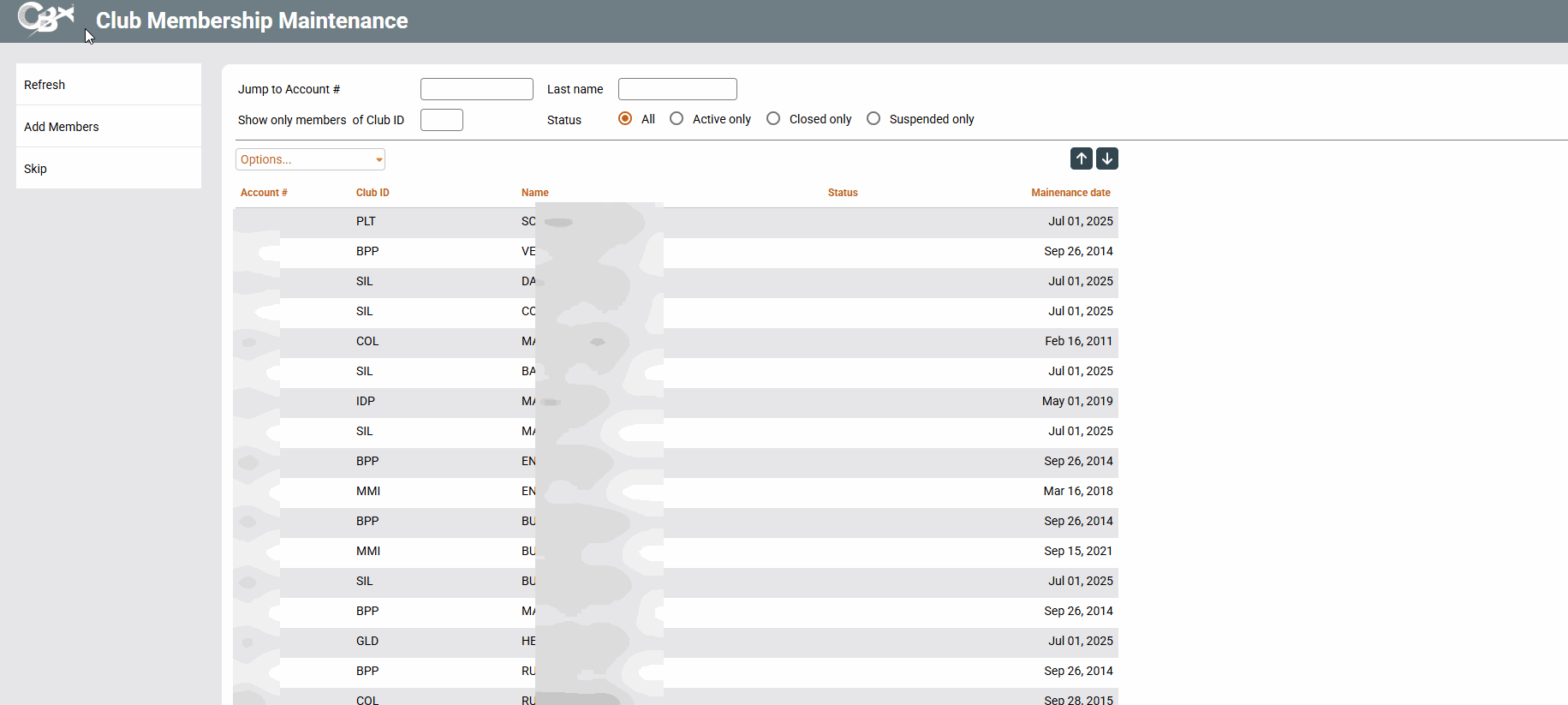 Or use the filters to limit the list to only the members you wish to review, by either Club ID or by status (all, active, suspended only, or closed only. Use Refresh (F5) at any time to view the entire list.