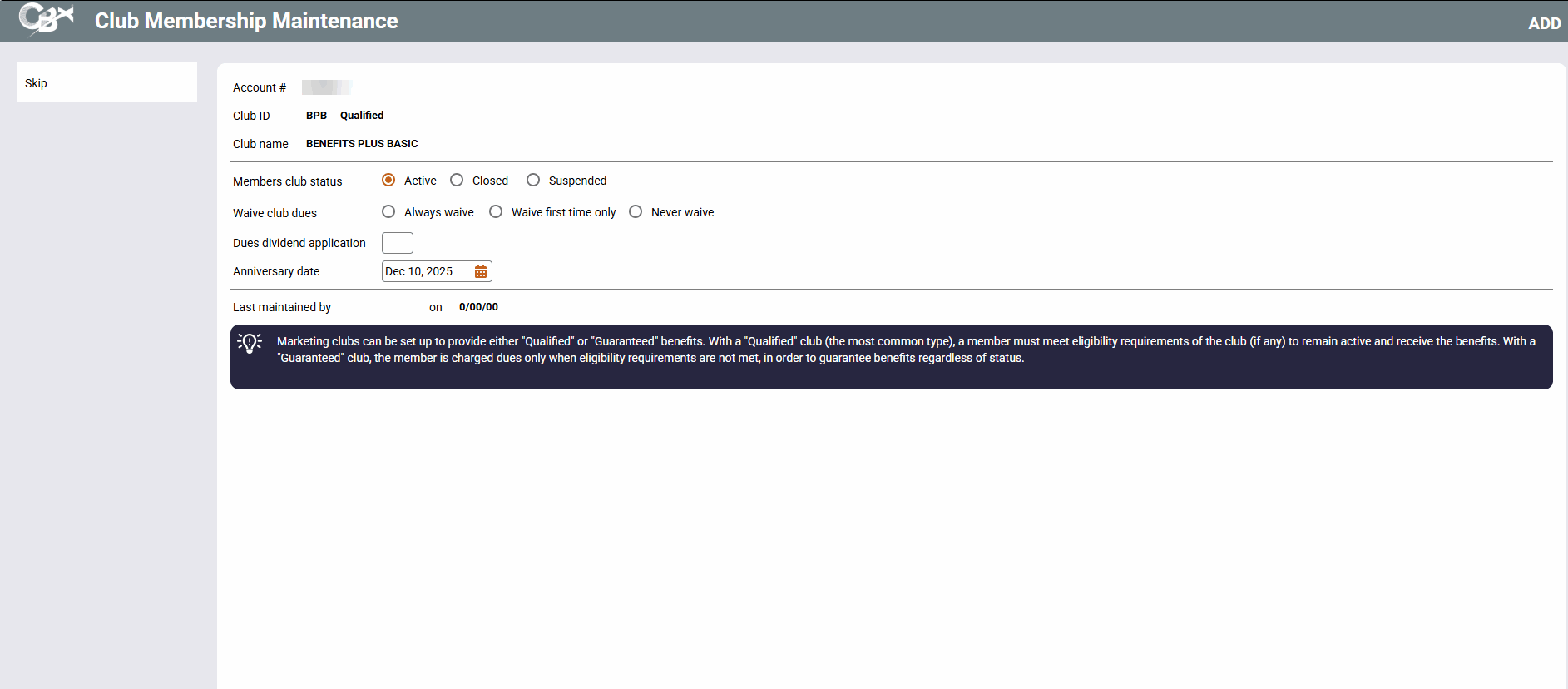 CU*TIP: Marketing clubs can be set up to provide either “Qualified” or “Guaranteed” benefits. With a “Qualified” club (the most common type), a member must be meet eligibility requirements of the club (if any) to remain active in the club and receive the benefits. With a “Guaranteed” club, the member is charged dues only when eligibility requirements are not met, in order to guarantee benefits regardless of status.