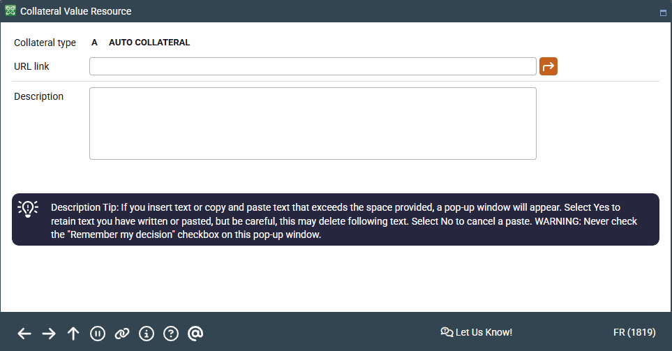 Use this screen to configure a website for a collateral item, which can be accessed when adding the collateral to a loan. This allows you to access websites on collateral values directly from the collateral record. For example, on your auto and RV collateral type codes, you can configure the URL for the Kelly Blue book or J.D. Power (formerly NADA) website. Then when your loan officers are working with the collateral items, there will be a handy link right there for them to use. This screen can also be used to add tips to the loan officers as well.