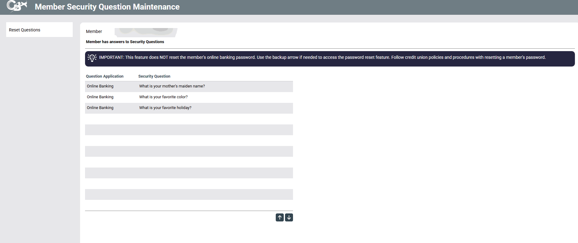 IMPORTANT NOTE: This feature does NOT reset the member's online banking password. If the member has forgotten his password or has disabled his access, use the back up arrow instead to access the feature that allows you to reset his password. There is also a feature on that screen to reset security questions at the same time.