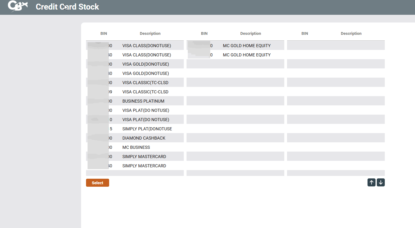 View a listing of the credit card stock configured for the credit union. Select a BIN and Select to move to the next screen.