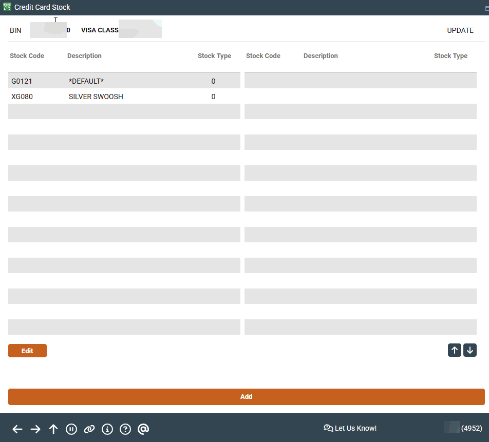 On this screen, you will view the Stock Code identifier (the plastic card stock code used with the plastics vendor—the physical plastic), a Description to help you identify the card stock, and the Stock Type.