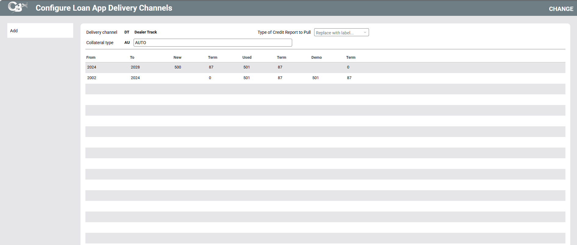 Credit unions can configure multiple vehicle years with a variety of products (that can be attached to the same year of the collateral) with any length of term. This screen lists the products associated with the various collateral years. CU*BASE uses this and applies it to incoming loan applications from indirect-delivery channels.