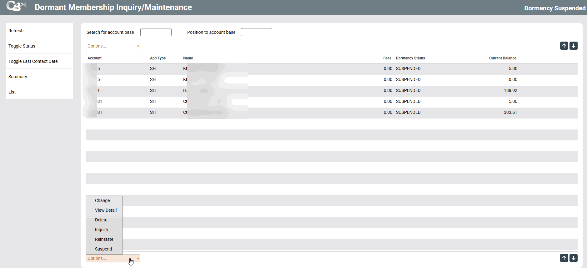 Use this to reinstate the dormancy status for a member that was previously suspended (as noted under the Dormancy Status column). This simply changes the status for all accounts under this account base from “SUSPENDED” to “DORMANT,” subject to normal dormancy fee processing. |