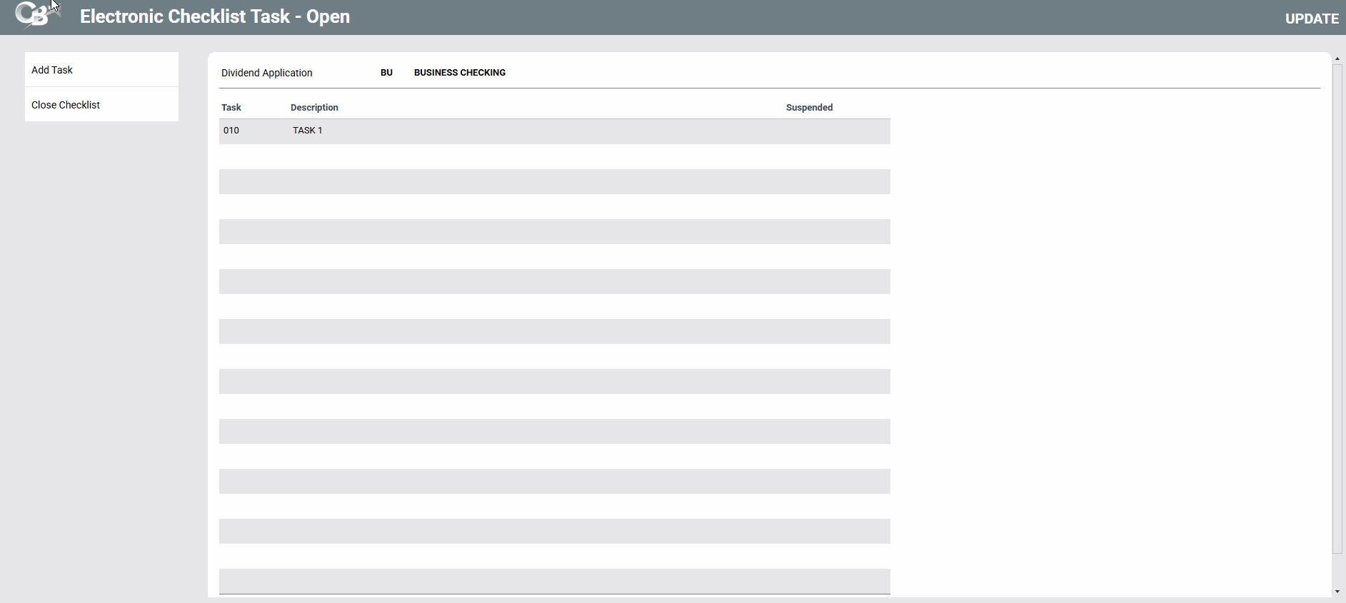 Use this screen to create the checklists and add tasks to it. If this is your base (000) account, this checklist is also is used as the membership task list for the Open/Closed Dashboard.