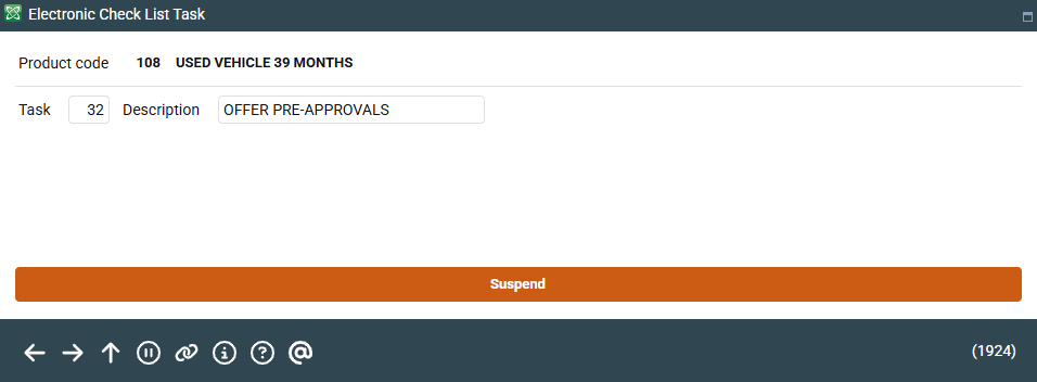 Use this to suspend the task so it is no longer visible on loan application screens. Return to this screen and use Enter to reverse the suspend procedure. |