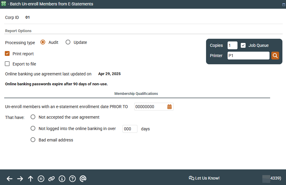 This is yet another tool to comply with Reg. E’s requirement to prove that members qualify to receive electronic communication! This feature allows you to unenroll members based on several criteria: not having accepted the online banking use agreement, not having logged in over a certain period, or having an email address marked as invalid by the system. Select to run an audit report; then run a final update to the system. You can select to print a report, export the data for use with Report Builder or Member Connect or both.