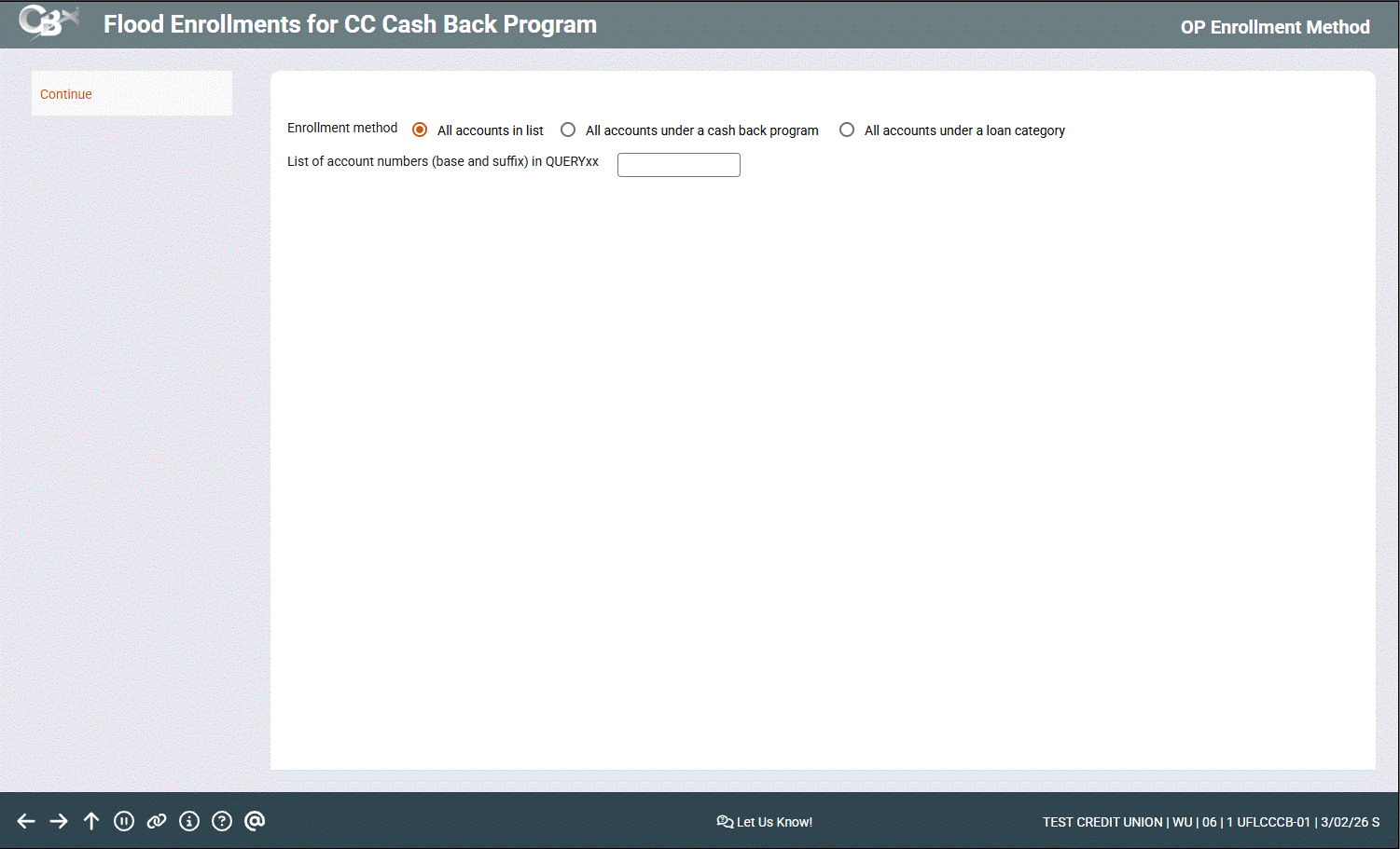 Select this option to display the cash back program code lookup; enter a valid cash back program. This flood option will enroll all eligible members under loan categories that are attached to the selected cash back program code but have not yet been enrolled into the program individually. |