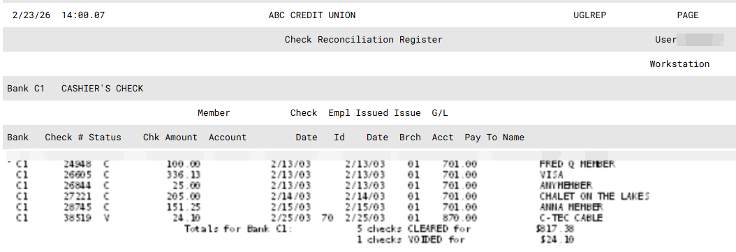 UGLREA G/L Check Reconciliation 2117 UGLREP |