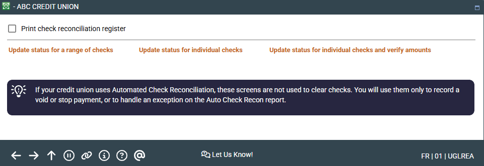 IMPORTANT: If your credit union uses Automated Check Reconciliation, these screens are not used to clear checks. You will use them only to record a void or stop payment, or to handle an exception on the Auto Check Recon report. Click here for a discussion of automatic reconciliation.