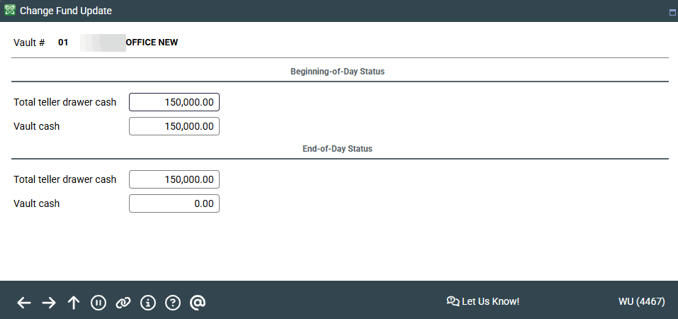 This screen is used to adjust the change fund data. Appropriate security clearance is required to use this feature. It is used only when there has been a system error which makes the teller system and the general ledger out of balance.