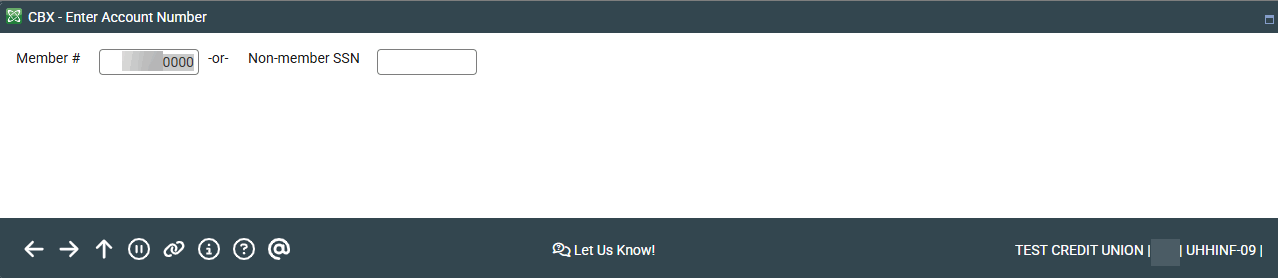If the new person is a credit union member, enter the member account base number and use Enter to proceed to the Household Enrollment window. If the household member is not a credit union member, enter a Social Security number instead. If necessary, a Non-Member Information window may appear so that basic details such as name and address can be recorded in the non-member database before proceeding to the Household Enrollment window.