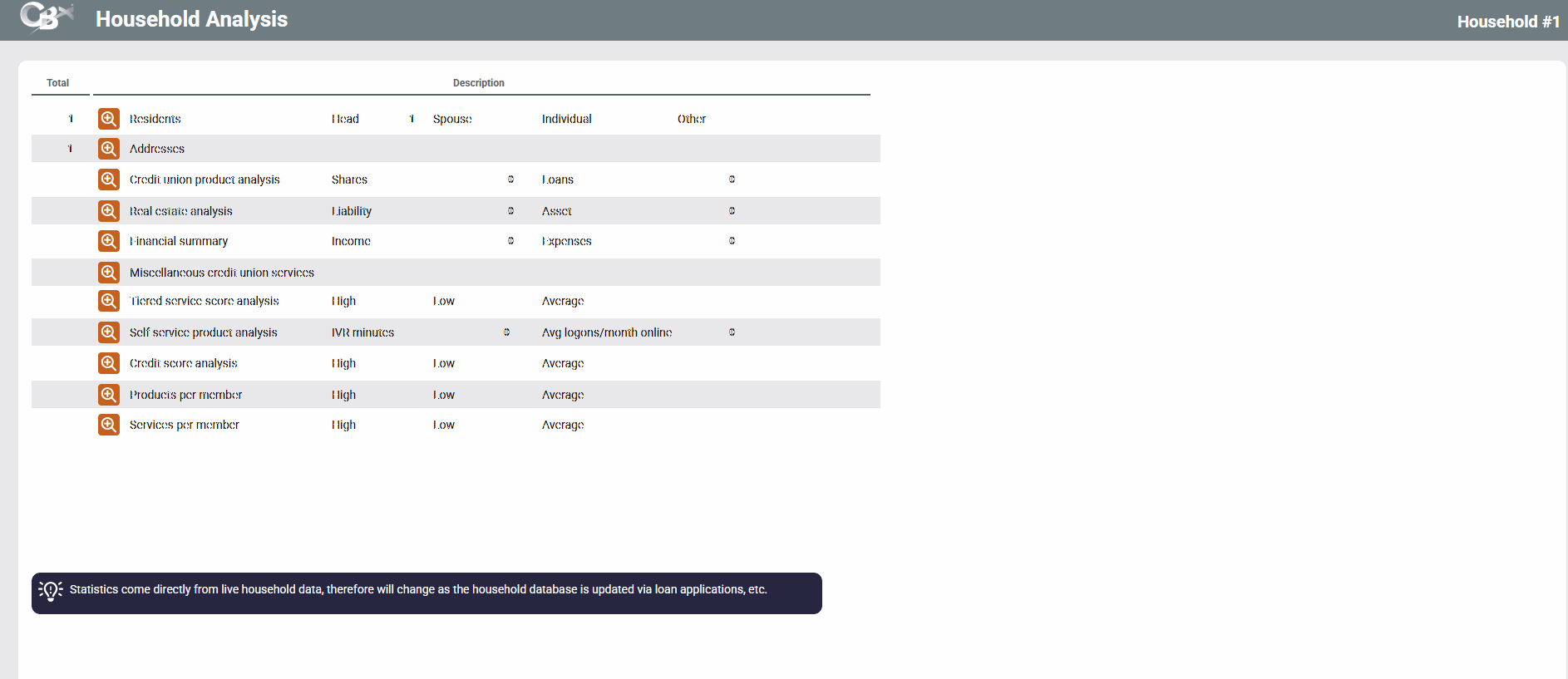 This screen is the first of several that provides detailed statistics about the members of an entire household. This information can provide valuable information to aid in the marketing of new credit union products and services, and to analyze the behavior patterns of certain types of memberships.