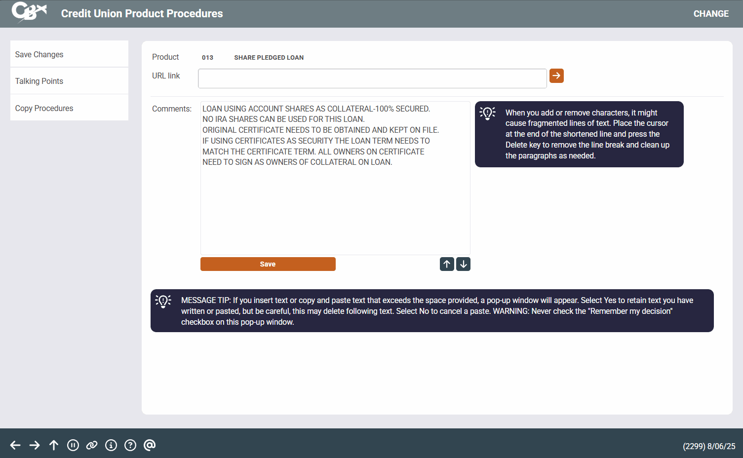 This screen lets you view or modify procedures and other notes associated with a specific credit union product (shares, certificates, or loans) or task (such as posting wire transfers) or other feature (such as assigning Membership Designations).
