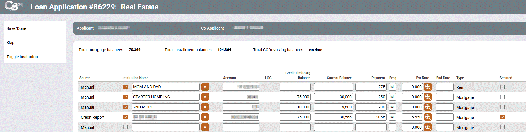 Access this screen by selectingAdd/Update RE, Add/Update Loans or Add/Update Cards from the Debts screen. To enter additional debts for a co-applicant, begin on the co-applicant screen.