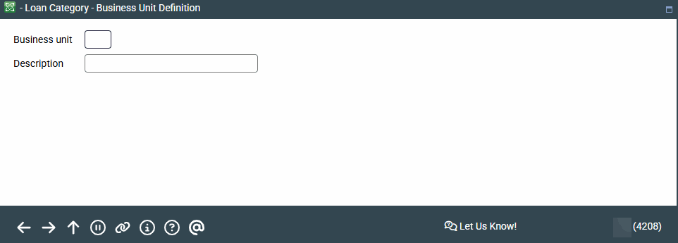 Enter the business unit two digit code (alpha or numeric) and description, then press Enter to return to the previous screen.