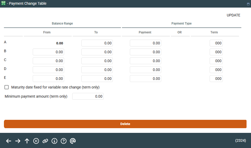 The Payment Table is used to determine payment amounts for open credit loans. This method determines a specific payment or term according to the loan's balance. Up to five different ranges can be specified, with a unique payment or term for loan balances which fall within each range. There are two methods which can be used: